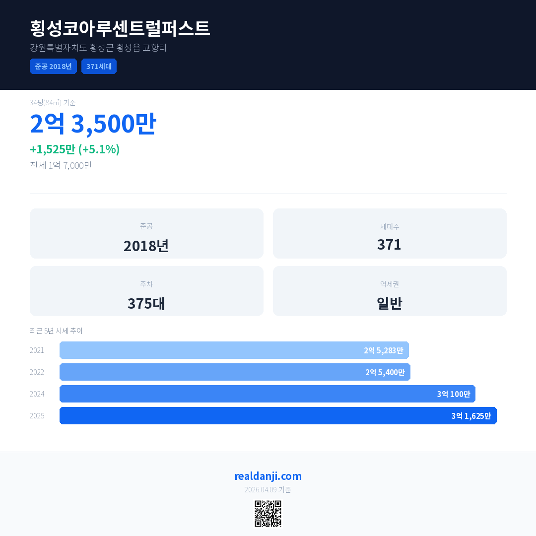 횡성코아루센트럴퍼스트 국민평형 기준 2025년 평균 거래가는 3억 1,625만으로, 전년 대비 5.1% 상승 했습니다.
