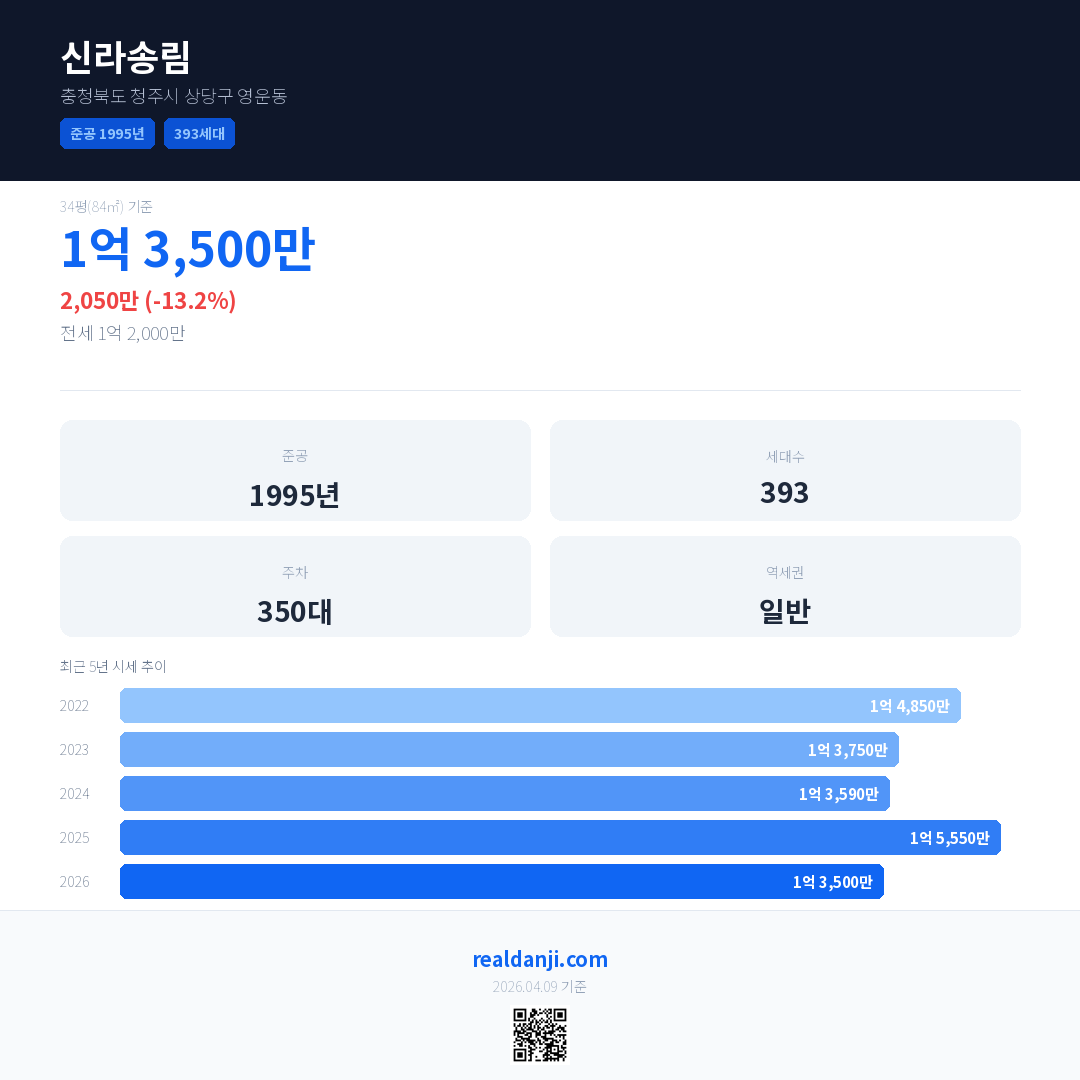 신라송림 국민평형 기준 2026년 평균 거래가는 1억 3,500만으로, 전년 대비 13.2% 하락 했습니다.