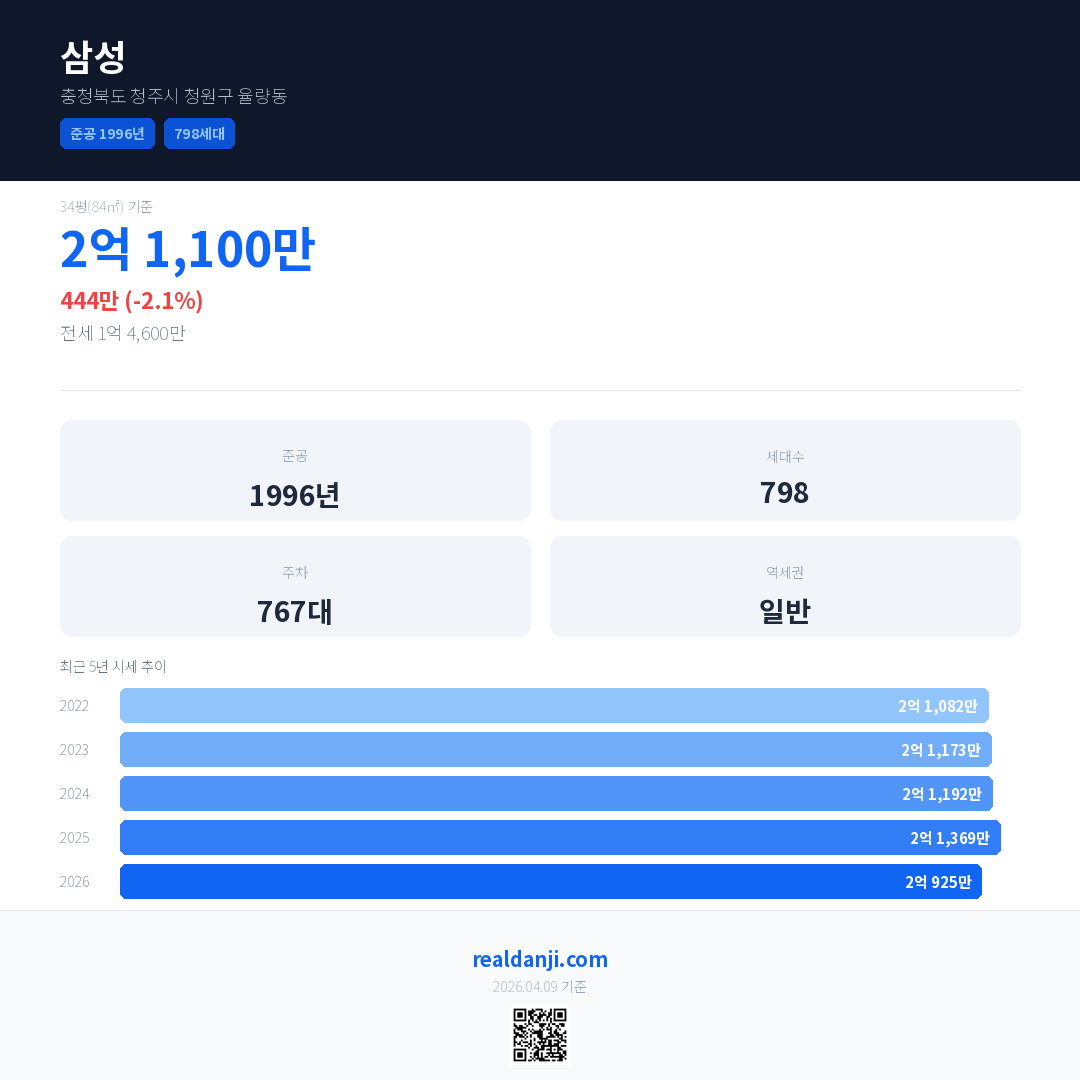 삼성 국민평형 기준 2026년 평균 거래가는 2억 925만으로, 전년 대비 2.1% 하락 했습니다.