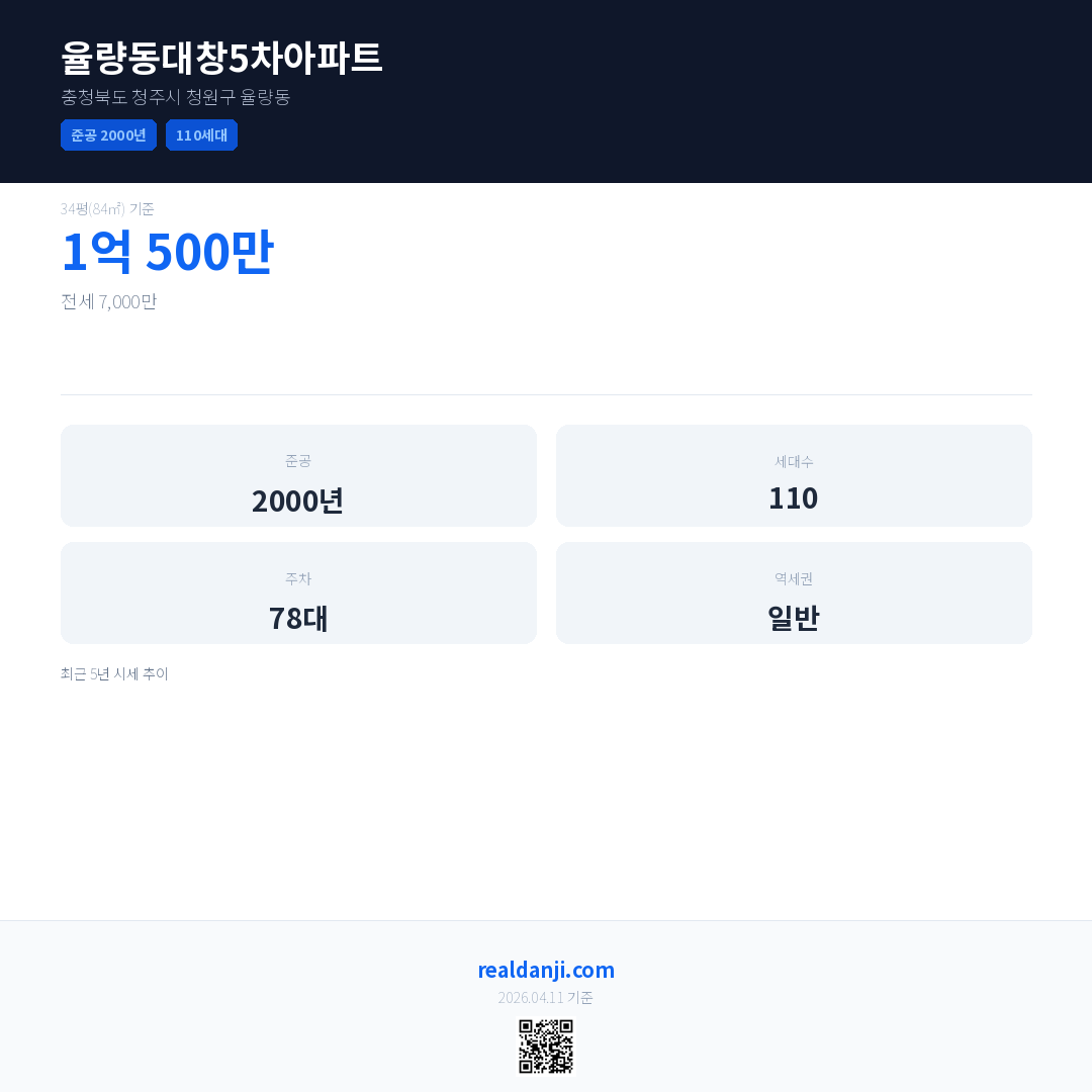율량동대창5차아파트은(는) 2000년에 준공되었으며, 현재 26년차입니다. 총 110세대 규모입니다.