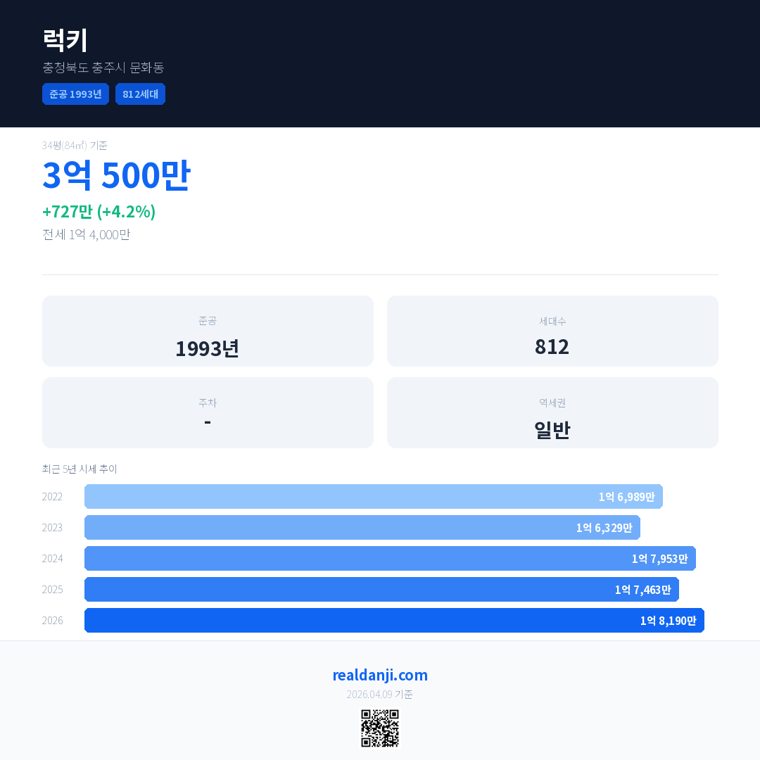 럭키은(는) 1993년에 준공되었으며, 현재 33년차입니다. 총 812세대 규모입니다.