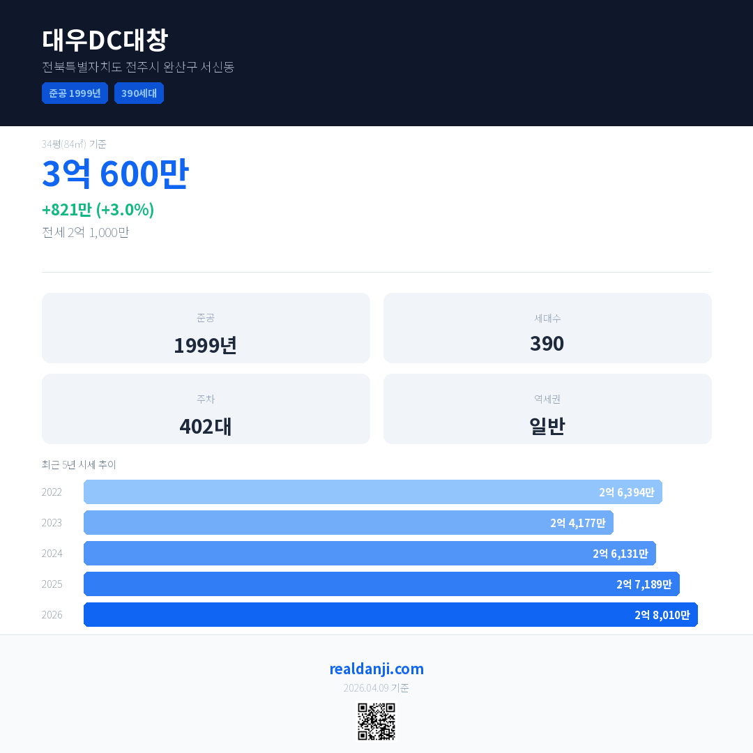 대우DC대창 최근 거래가는 3억 600만입니다. (2026-03)