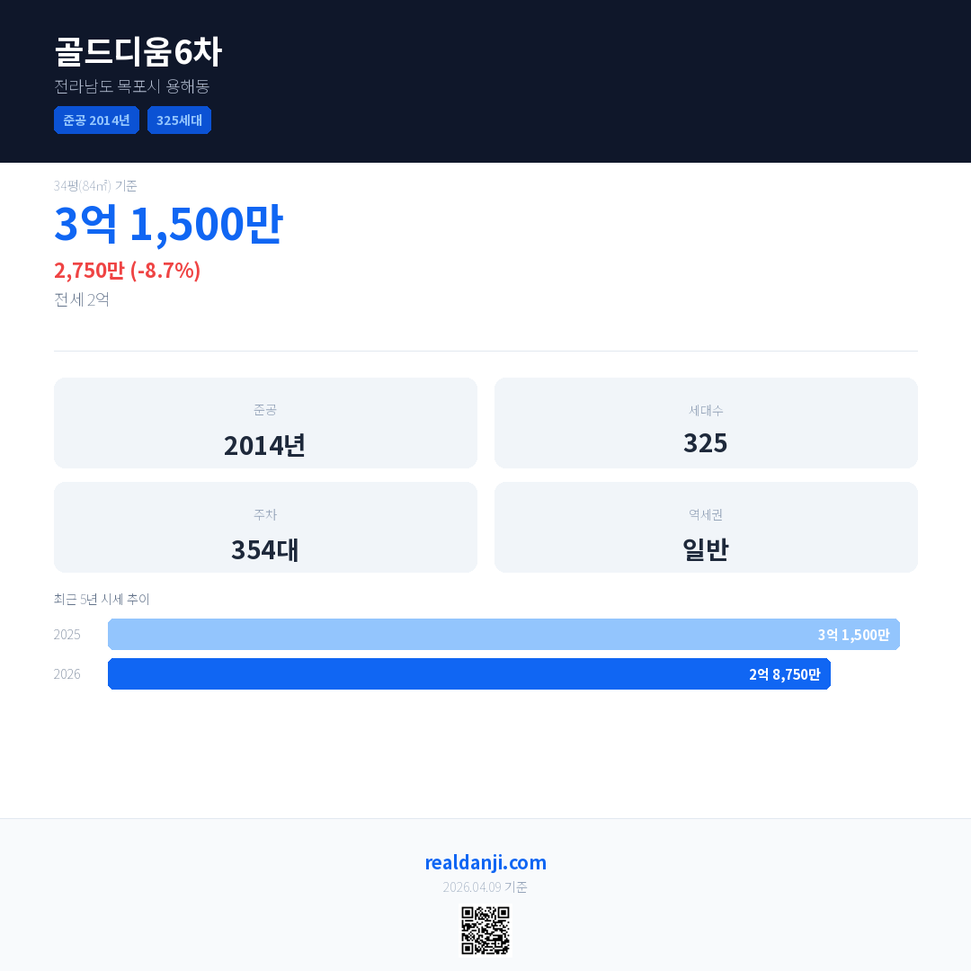 골드디움6차 국민평형 기준 2026년 평균 거래가는 2억 8,750만으로, 전년 대비 8.7% 하락 했습니다.