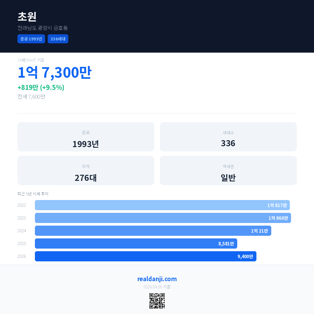 초원 국민평형 기준 2026년 평균 거래가는 9,400만으로, 전년 대비 9.5% 상승 했습니다.