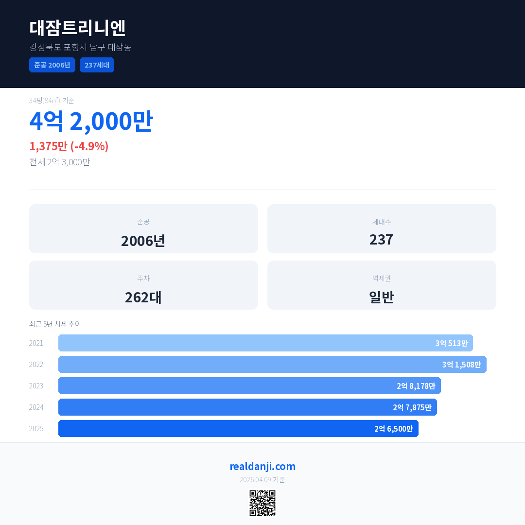대잠트리니엔 국민평형 기준 2025년 평균 거래가는 2억 6,500만으로, 전년 대비 4.9% 하락 했습니다.