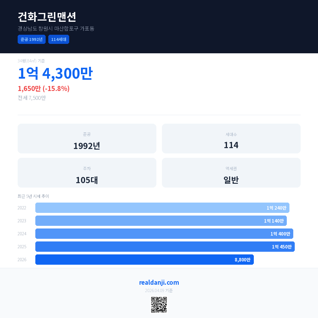 건화그린맨션 국민평형 기준 2026년 평균 거래가는 8,800만으로, 전년 대비 15.8% 하락 했습니다.