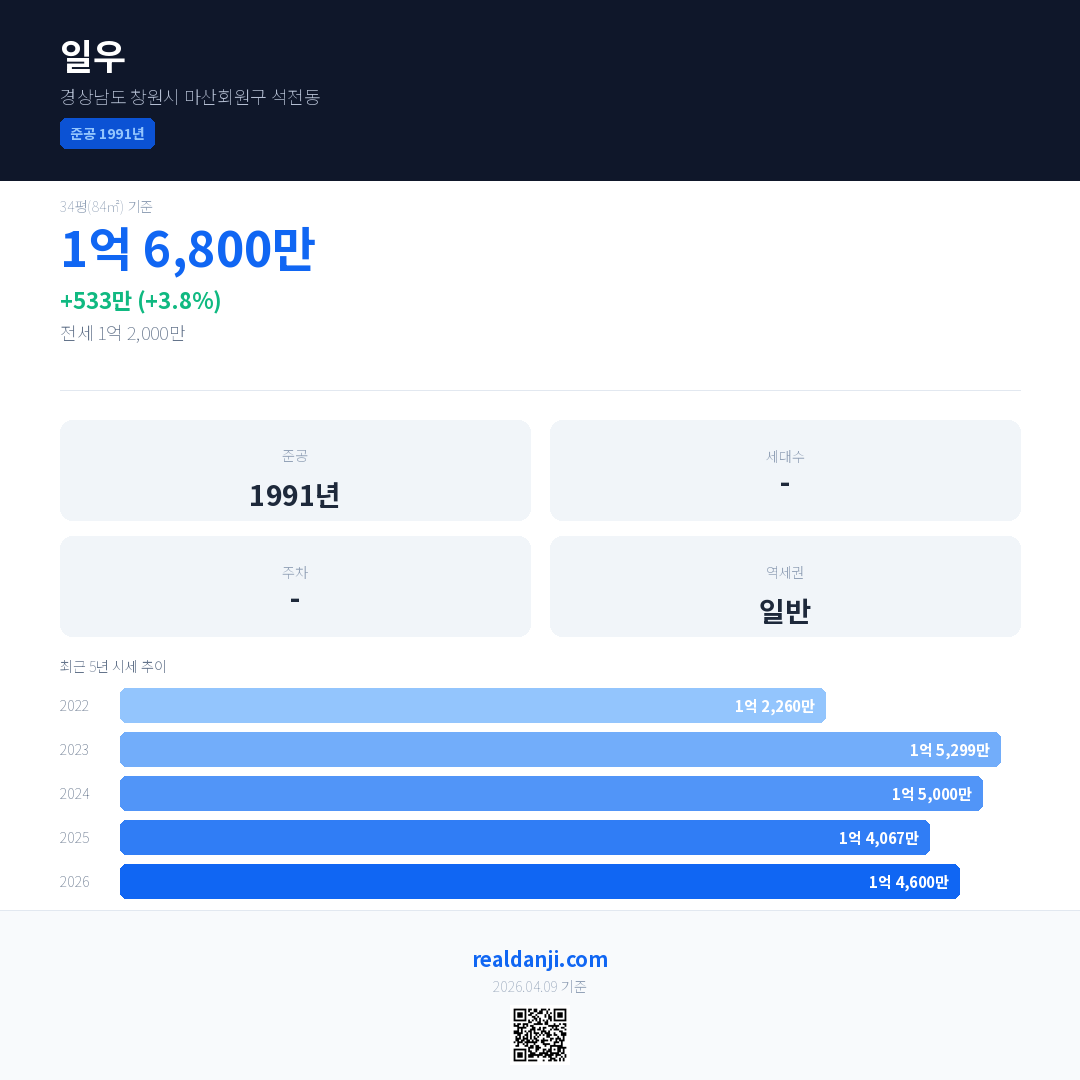 일우 국민평형 기준 2026년 평균 거래가는 1억 4,600만으로, 전년 대비 3.8% 상승 했습니다.
