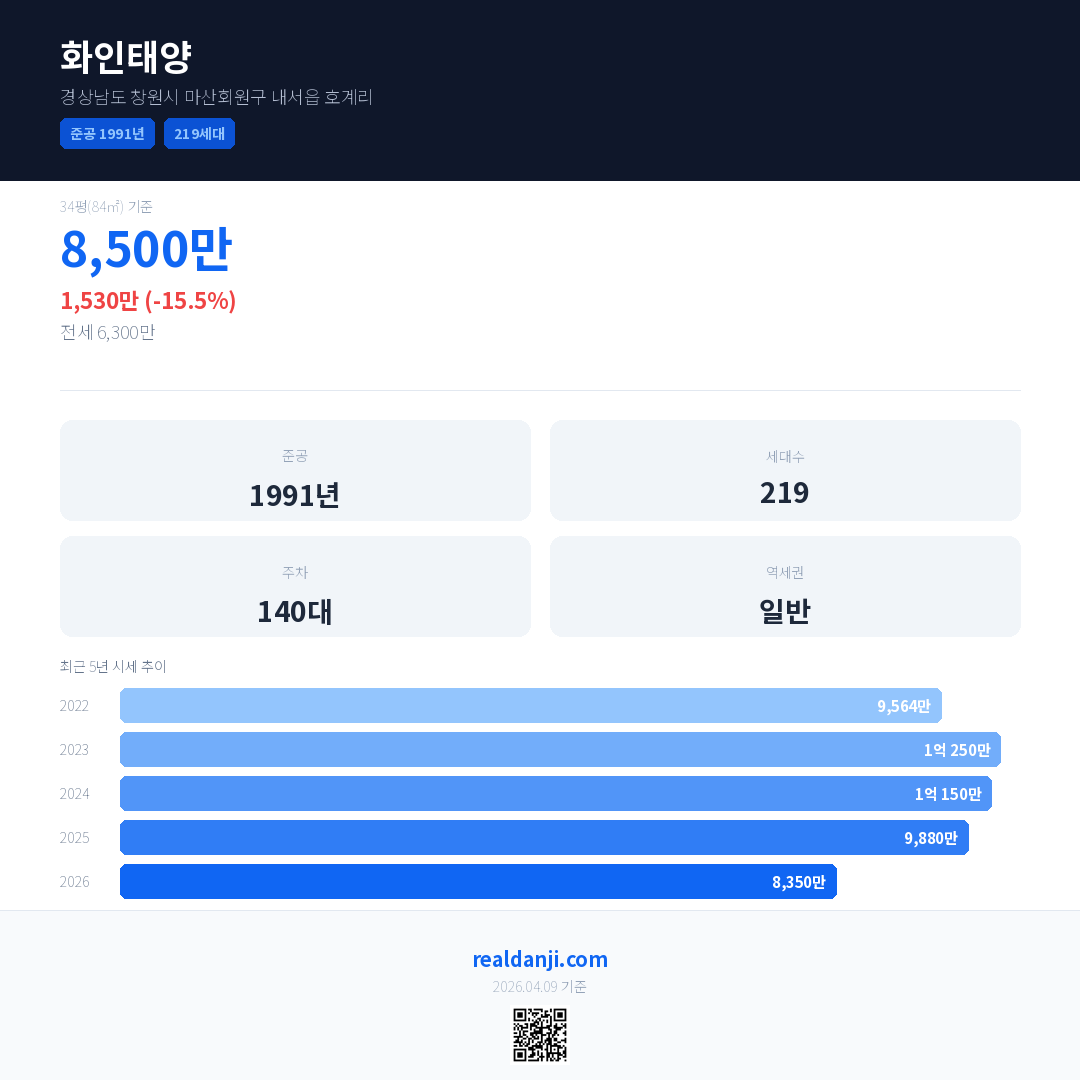 화인태양 국민평형 기준 2026년 평균 거래가는 8,350만으로, 전년 대비 15.5% 하락 했습니다.