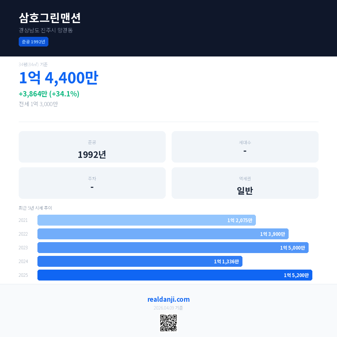 삼호그린맨션 국민평형 기준 2025년 평균 거래가는 1억 5,200만으로, 전년 대비 34.1% 상승 했습니다.