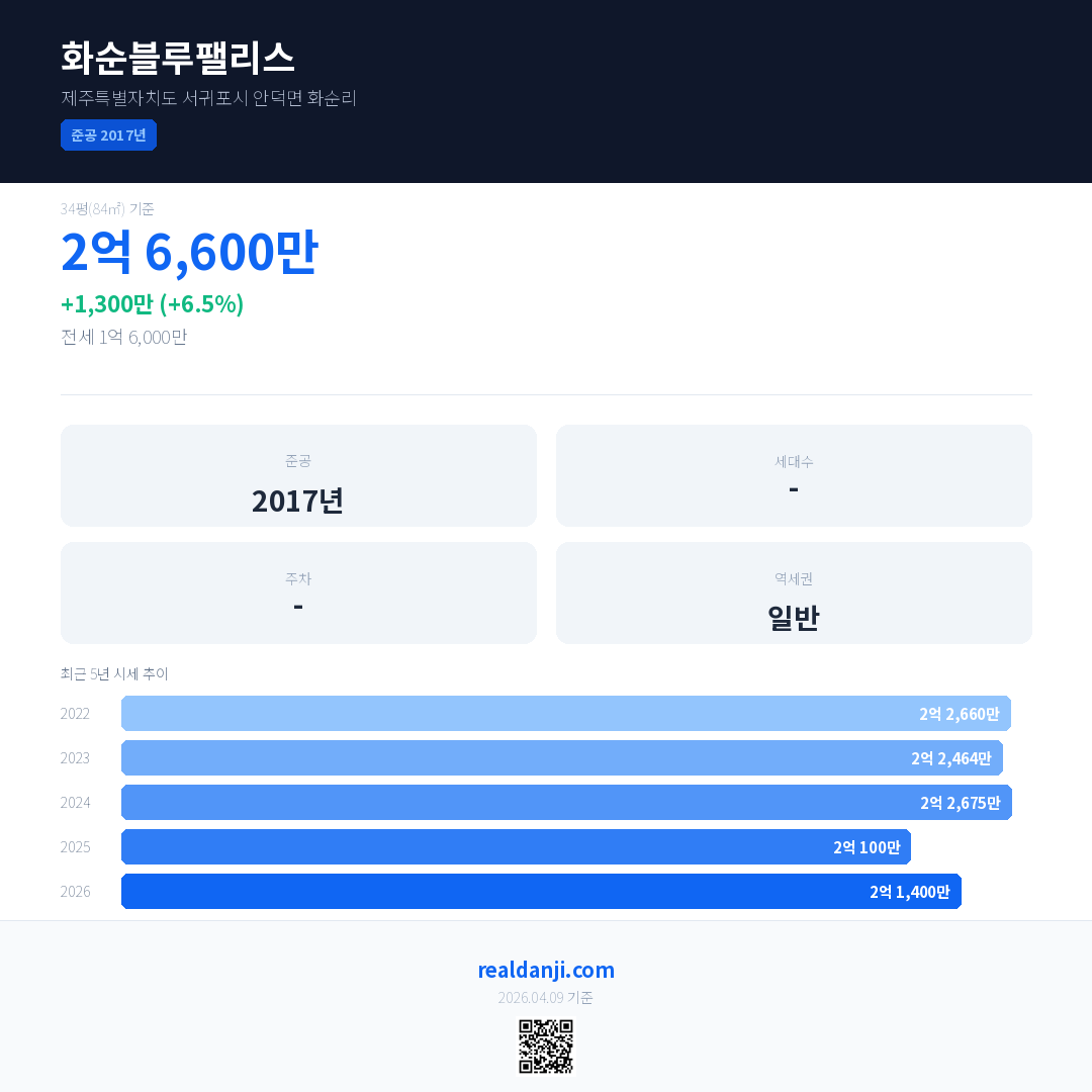 화순블루팰리스 국민평형 기준 2026년 평균 거래가는 2억 1,400만으로, 전년 대비 6.5% 상승 했습니다.