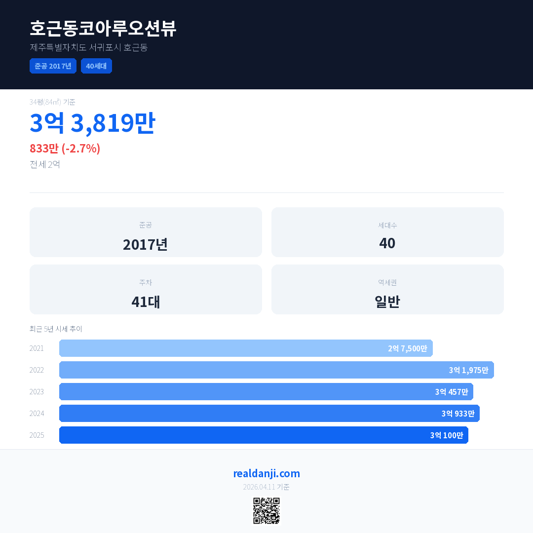 호근동코아루오션뷰은(는) 2017년에 준공되었으며, 현재 9년차입니다. 총 40세대 규모입니다.