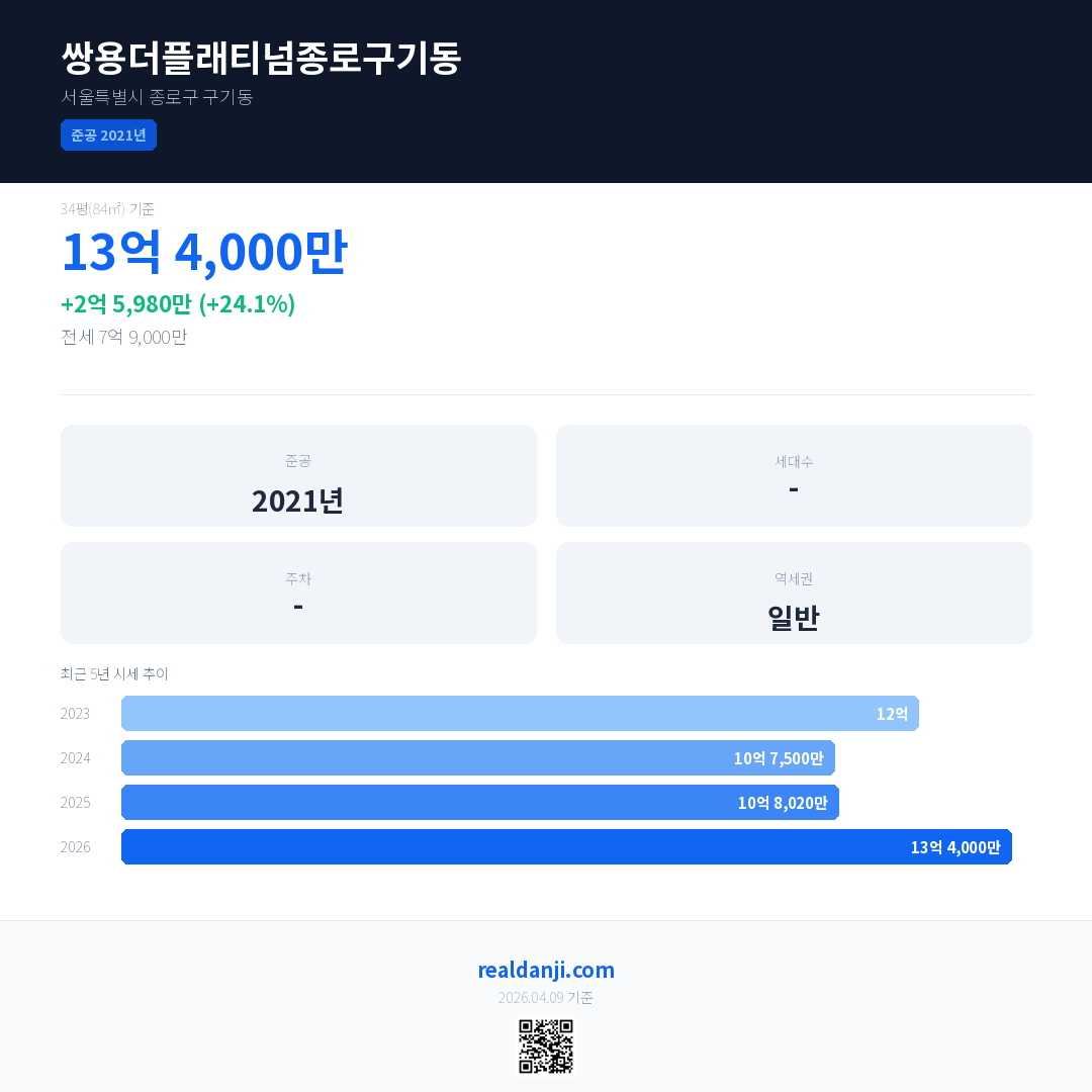쌍용더플래티넘종로구기동 국민평형 기준 2026년 평균 거래가는 13억 4,000만으로, 전년 대비 24.1% 상승 했습니다.