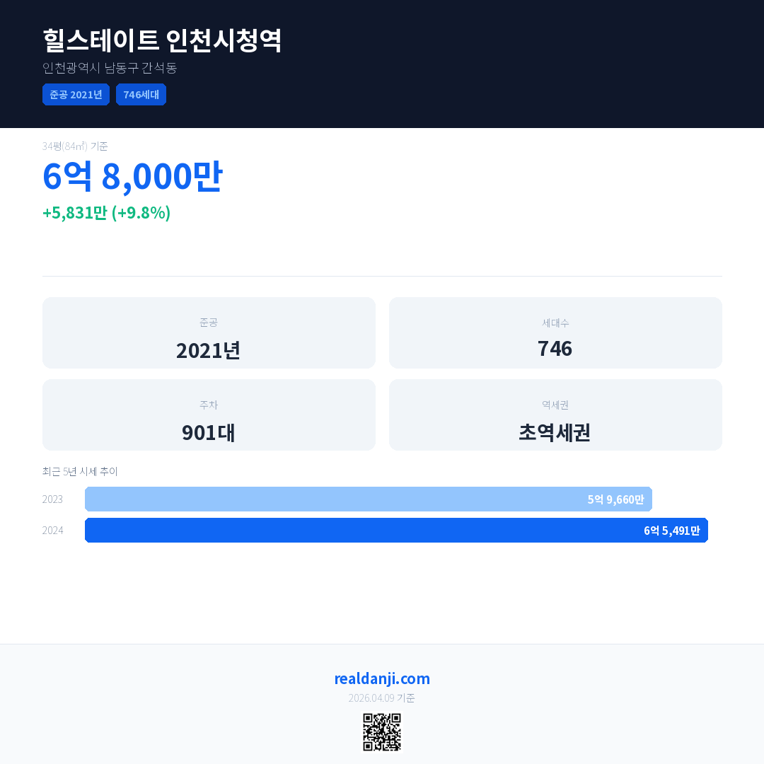 힐스테이트 인천시청역 최근 거래가는 6억 8,000만입니다. (2025-05)