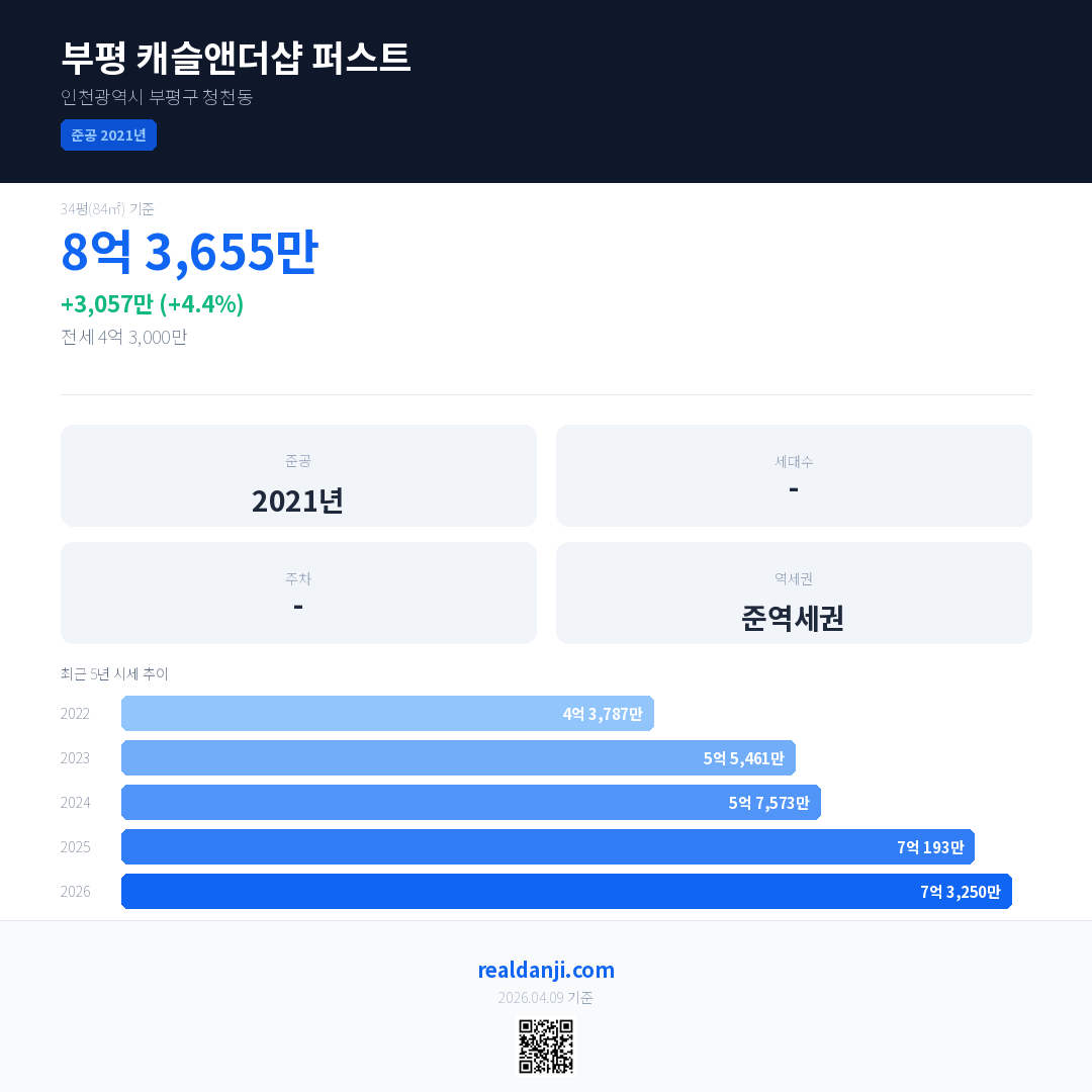 부평 캐슬앤더샵 퍼스트은(는) 2021년에 준공되었으며, 현재 5년차입니다.