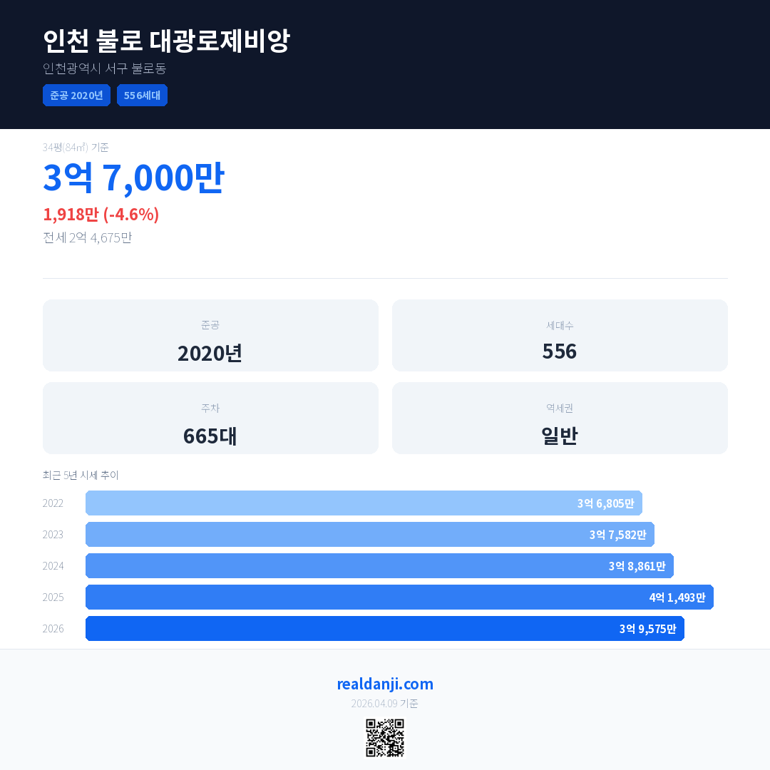인천 불로 대광로제비앙 국민평형 기준 2026년 평균 거래가는 3억 9,575만으로, 전년 대비 4.6% 하락 했습니다.