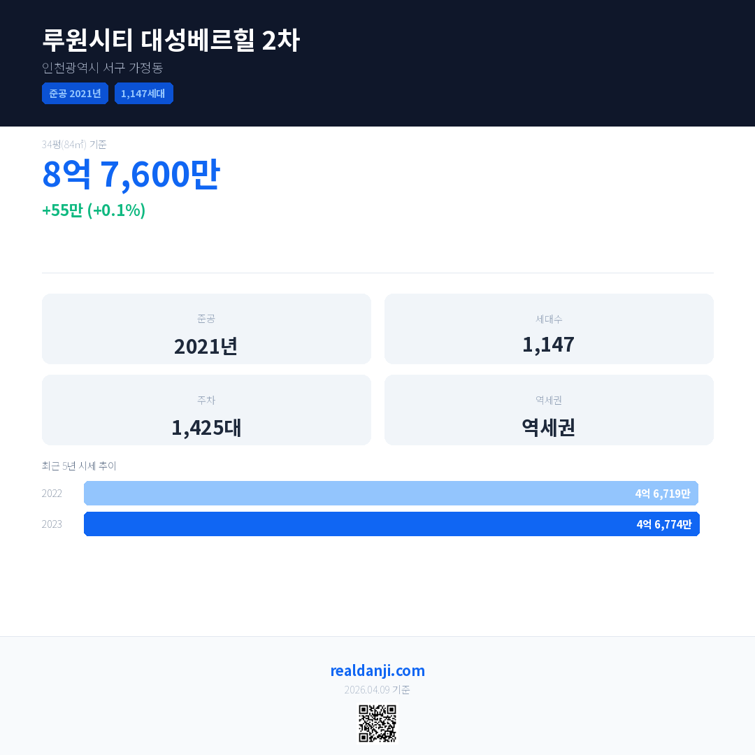 루원시티 대성베르힐 2차 국민평형 기준 2023년 평균 거래가는 4억 6,774만으로, 전년 대비 0.1% 상승 했습니다.