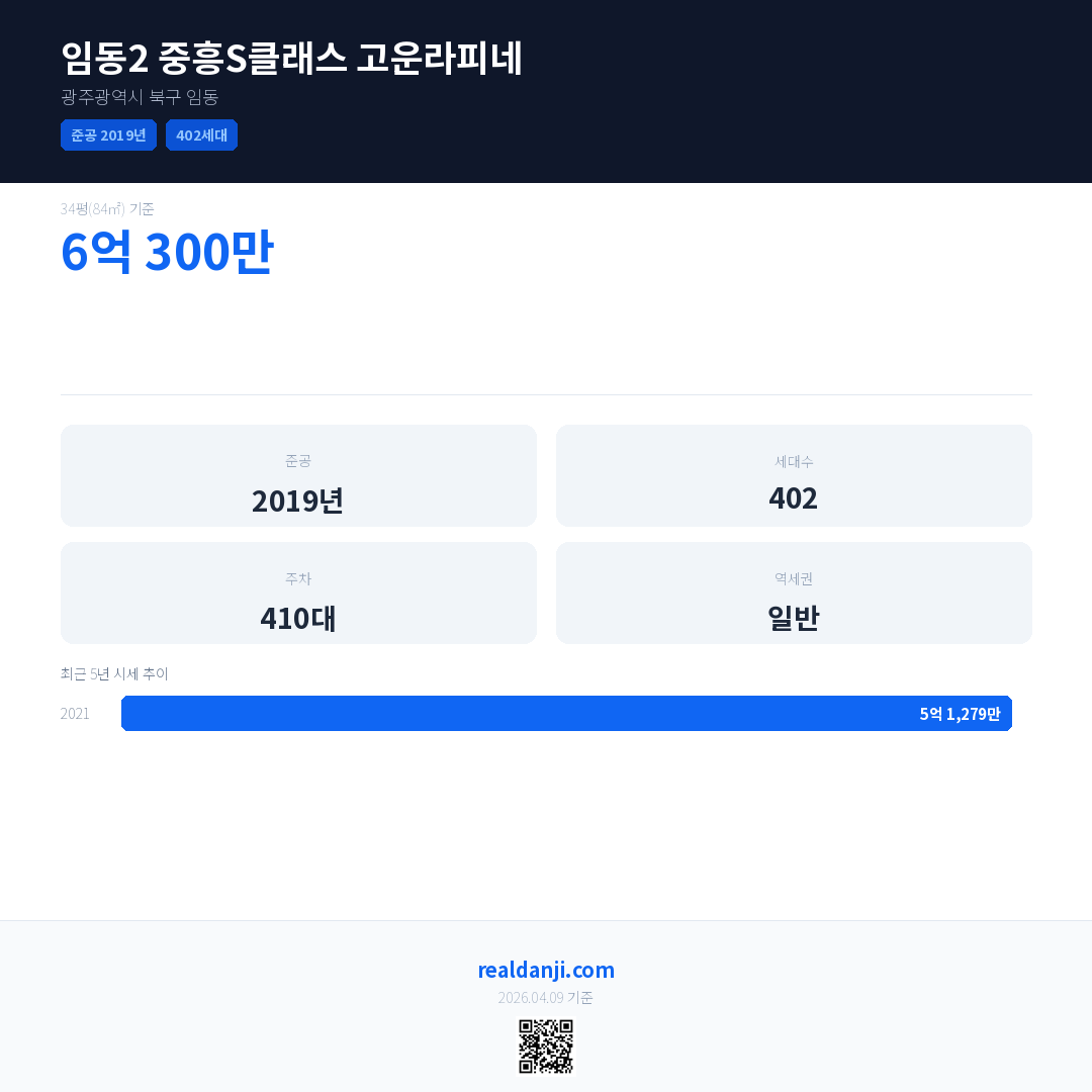 임동2 중흥S클래스 고운라피네은(는) 2019년에 준공되었으며, 현재 7년차입니다. 총 402세대 규모입니다.