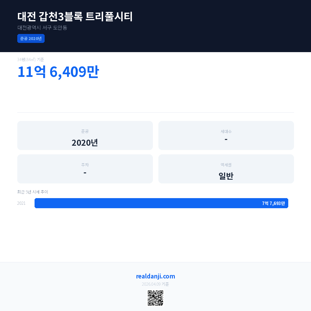 대전 갑천3블록 트리풀시티은(는) 2020년에 준공되었으며, 현재 6년차입니다.