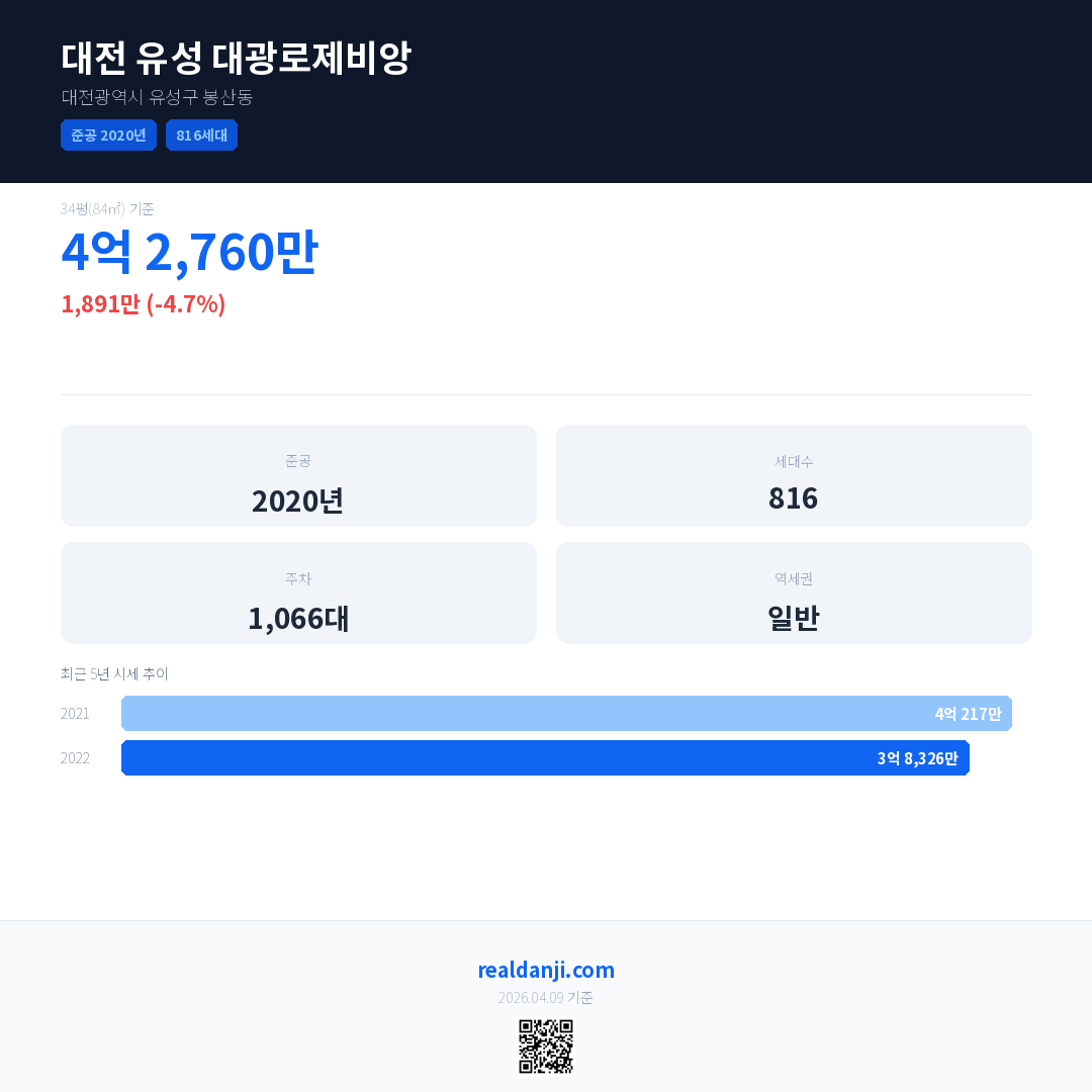 대전 유성 대광로제비앙 최근 거래가는 4억 2,760만입니다. (2022-11)