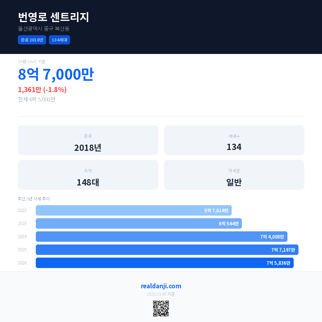 번영로 센트리지은(는) 2018년에 준공되었으며, 현재 8년차입니다. 총 134세대 규모입니다.