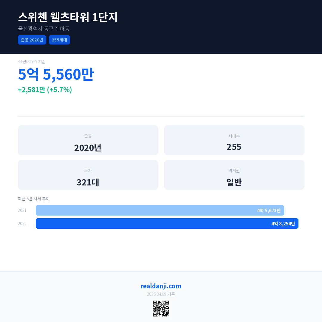 스위첸 웰츠타워 1단지은(는) 2020년에 준공되었으며, 현재 6년차입니다. 총 255세대 규모입니다.