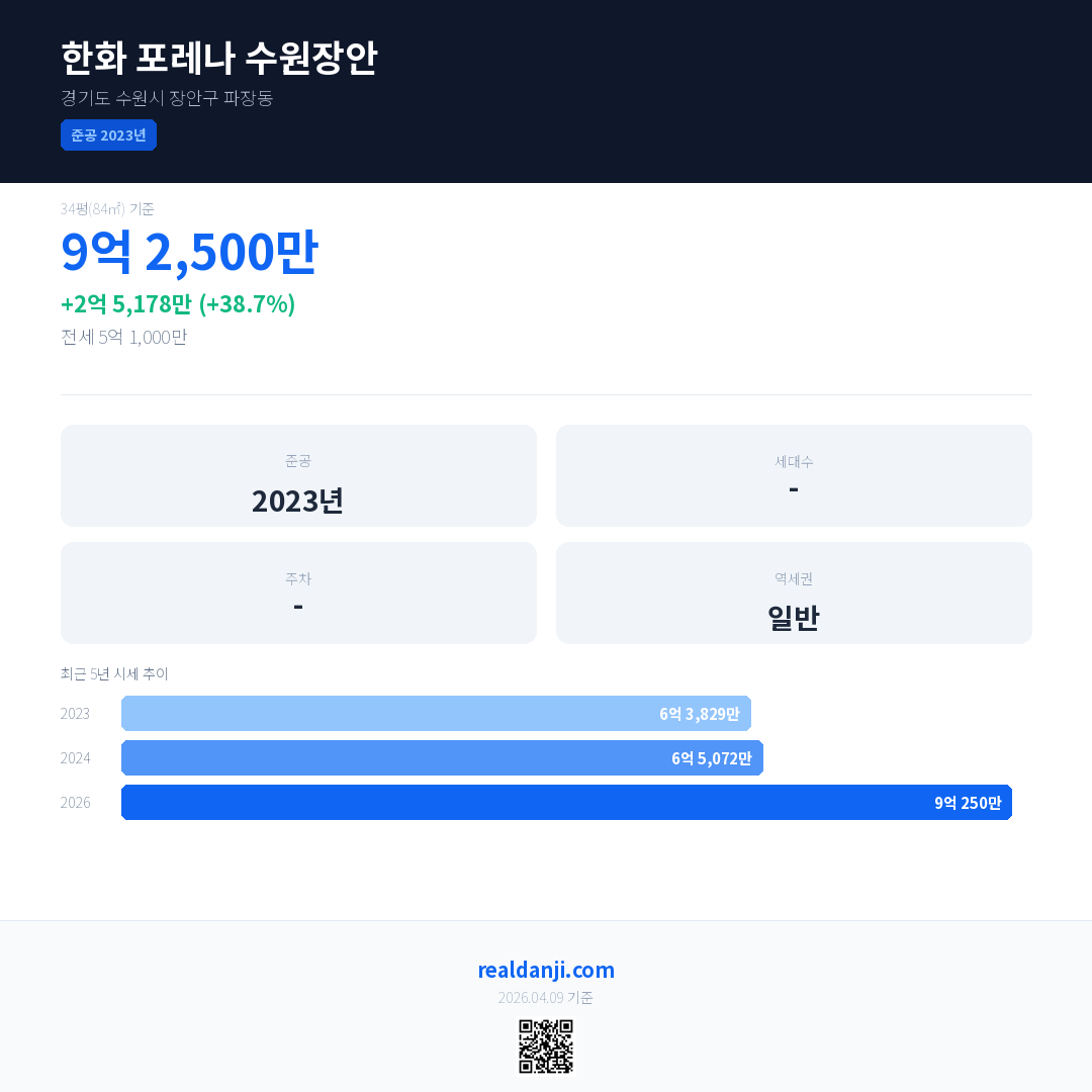 한화 포레나 수원장안 최근 거래가는 9억 2,500만입니다. (2026-02)