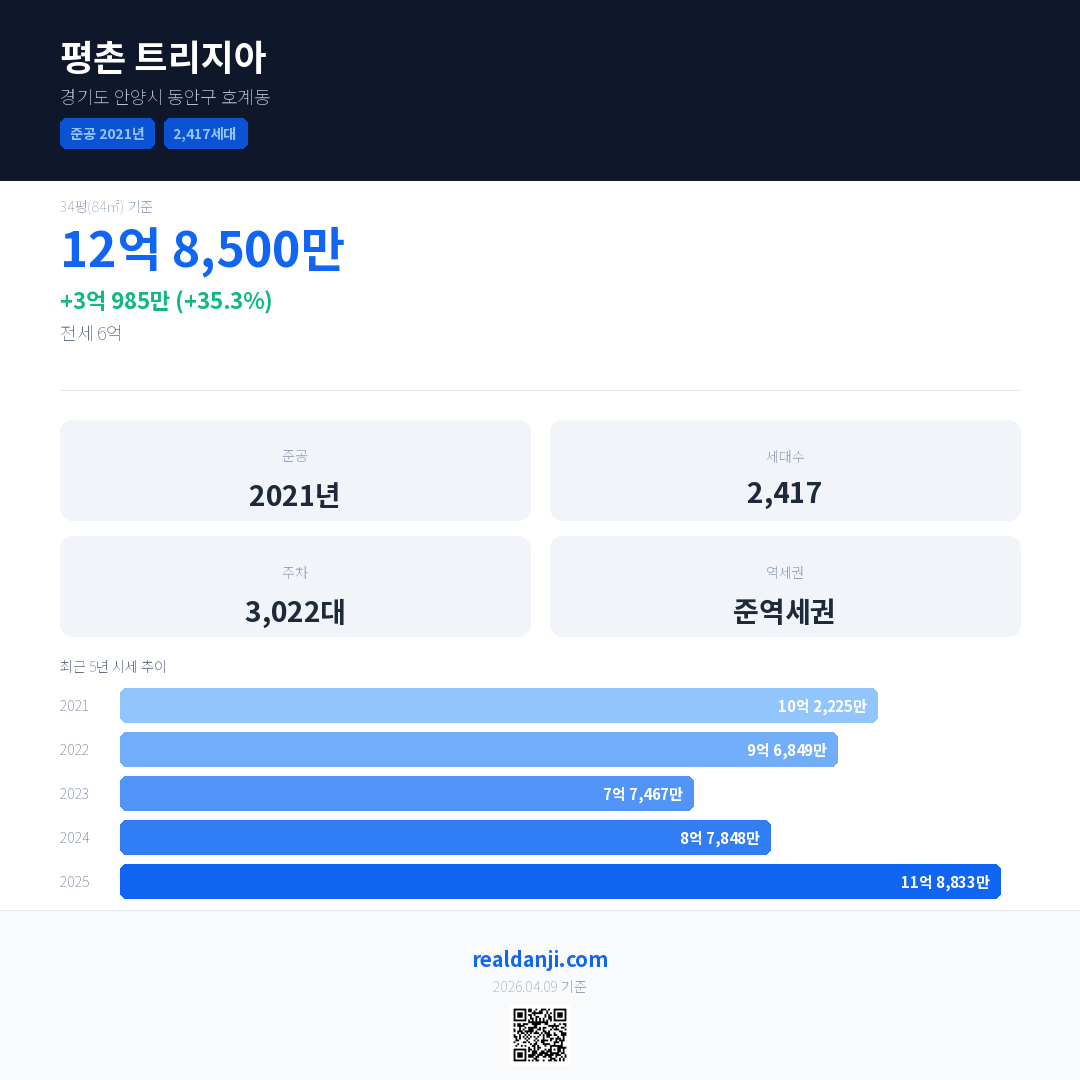 평촌 트리지아 국민평형 기준 2025년 평균 거래가는 11억 8,833만으로, 전년 대비 35.3% 상승 했습니다.