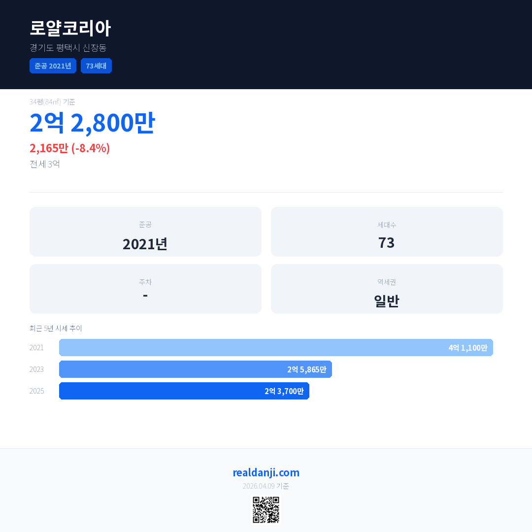 로얄코리아 국민평형 기준 2025년 평균 거래가는 2억 3,700만으로, 전년 대비 8.4% 하락 했습니다.