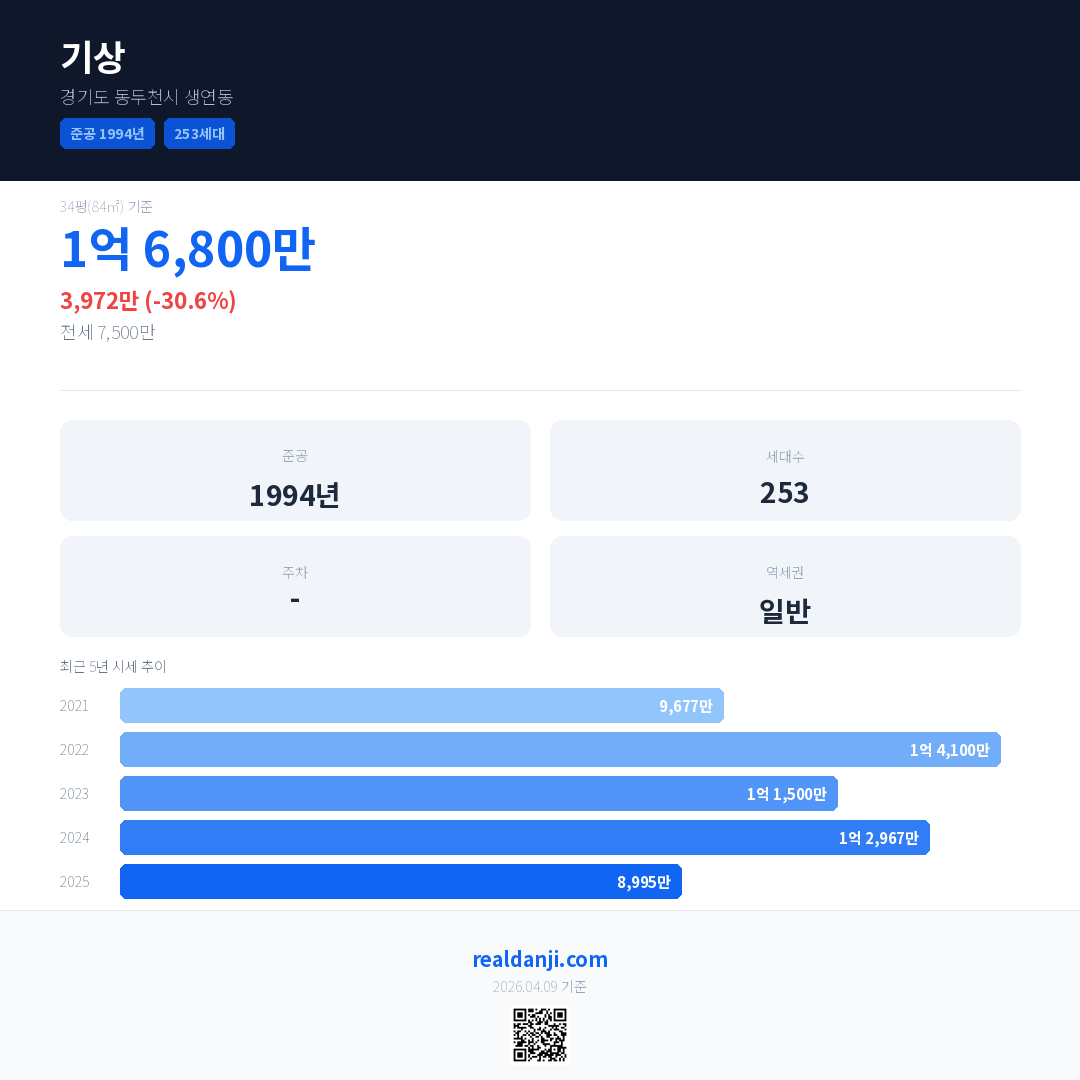 기상은(는) 1994년에 준공되었으며, 현재 32년차입니다. 총 253세대 규모입니다.