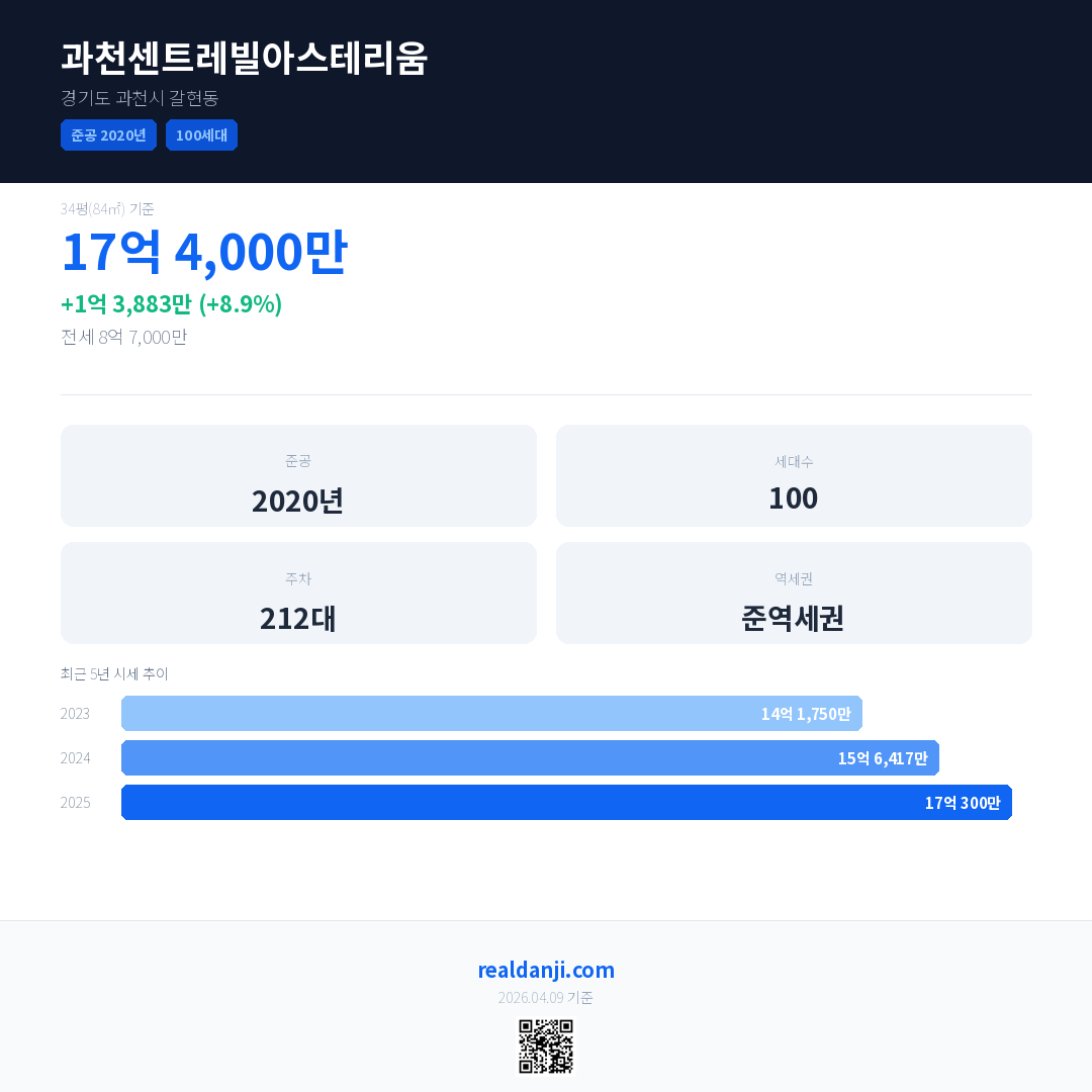 과천센트레빌아스테리움 국민평형 기준 2025년 평균 거래가는 17억 300만으로, 전년 대비 8.9% 상승 했습니다.