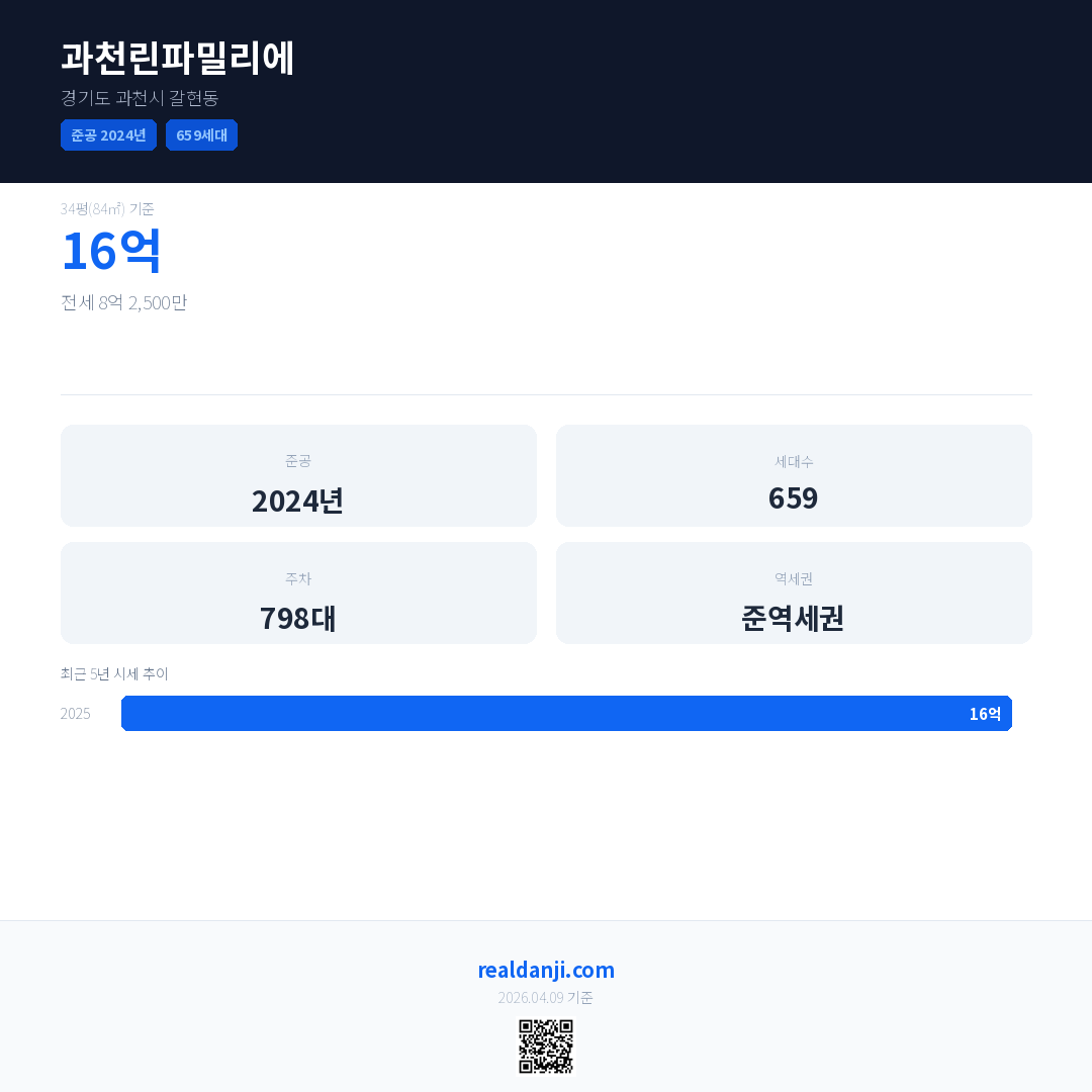 과천린파밀리에 최근 거래가는 16억입니다. (2025-10)