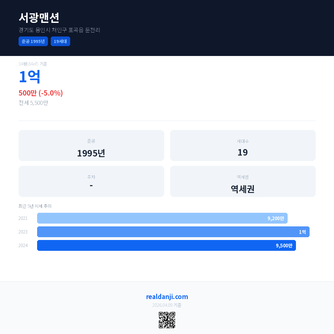 서광맨션 국민평형 기준 2024년 평균 거래가는 9,500만으로, 전년 대비 5.0% 하락 했습니다.