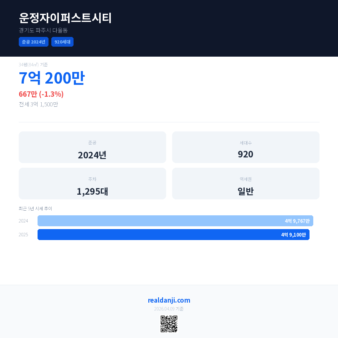 운정자이퍼스트시티 최근 거래가는 7억 200만입니다. (2025-04)