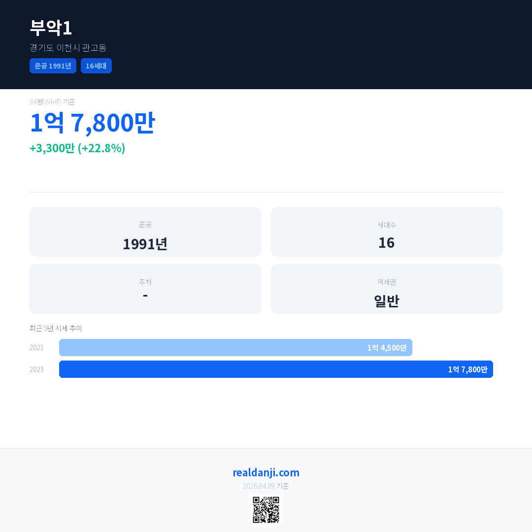 부악1 국민평형 기준 2023년 평균 거래가는 1억 7,800만으로, 전년 대비 22.8% 상승 했습니다.
