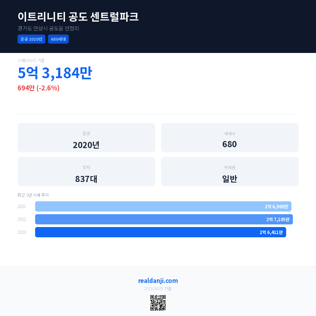 이트리니티 공도 센트럴파크은(는) 2020년에 준공되었으며, 현재 6년차입니다. 총 680세대 규모입니다.