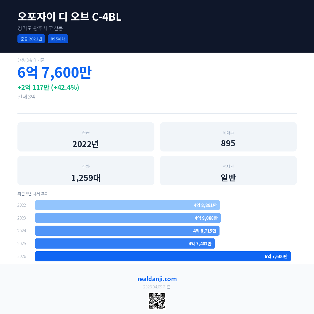 오포자이 디 오브 C-4BL 국민평형 기준 2026년 평균 거래가는 6억 7,600만으로, 전년 대비 42.4% 상승 했습니다.