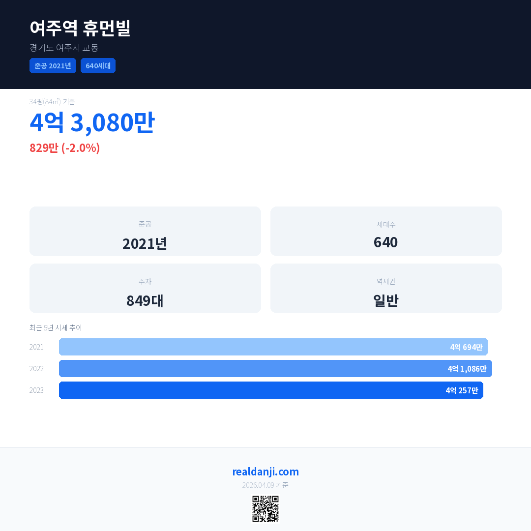 여주역 휴먼빌은(는) 2021년에 준공되었으며, 현재 5년차입니다. 총 640세대 규모입니다.