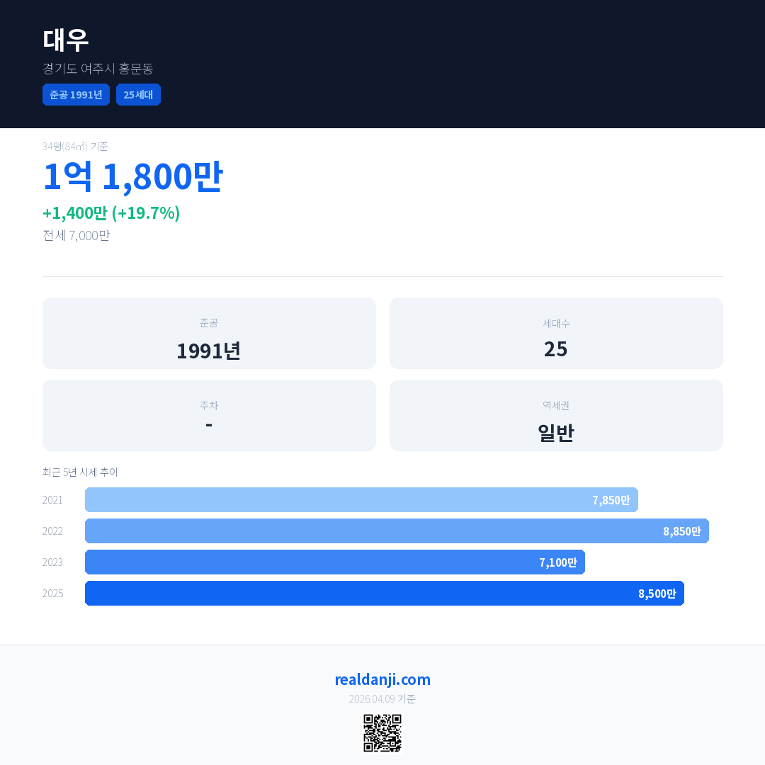 대우 국민평형 기준 2025년 평균 거래가는 8,500만으로, 전년 대비 19.7% 상승 했습니다.