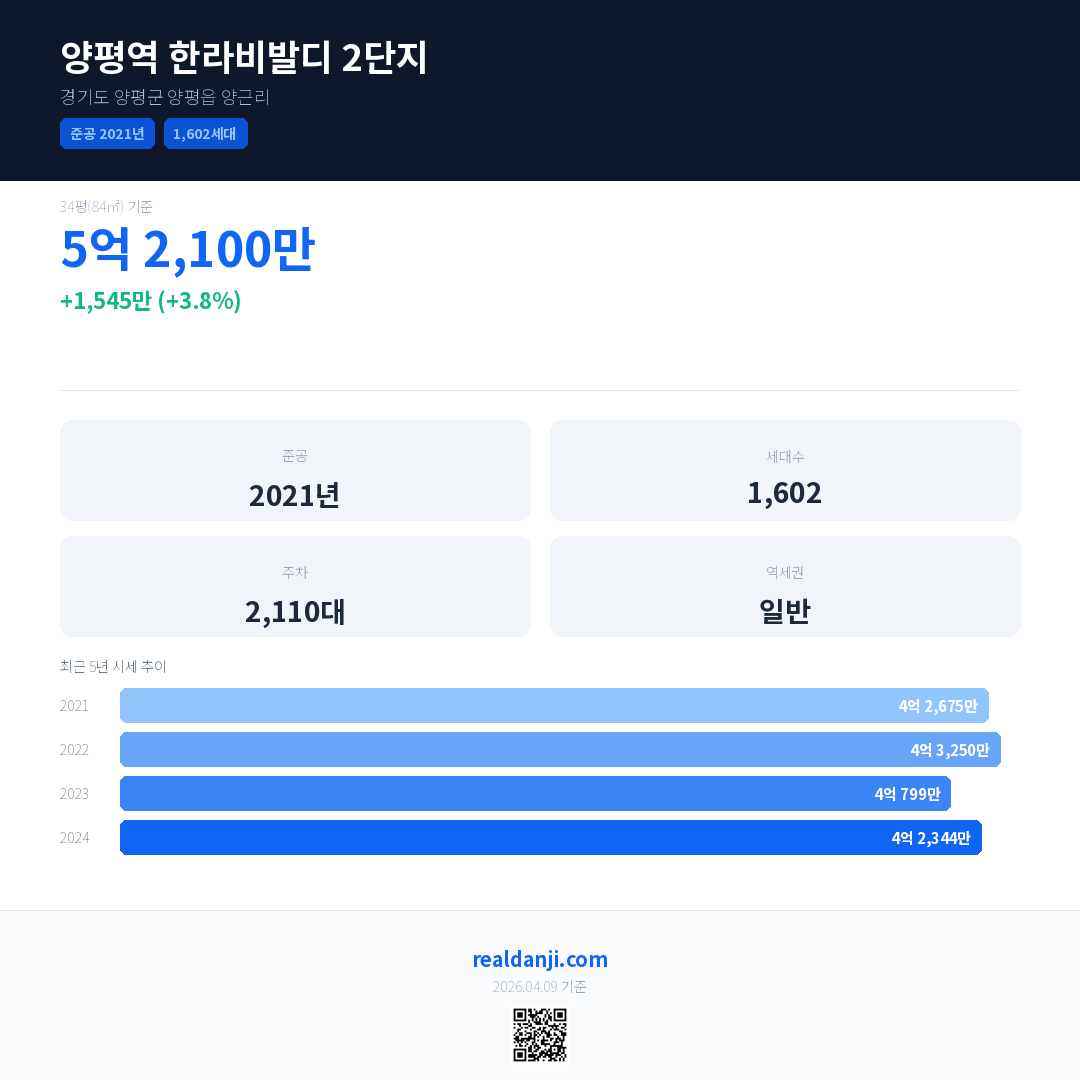 양평역 한라비발디 2단지 국민평형 기준 2024년 평균 거래가는 4억 2,344만으로, 전년 대비 3.8% 상승 했습니다.