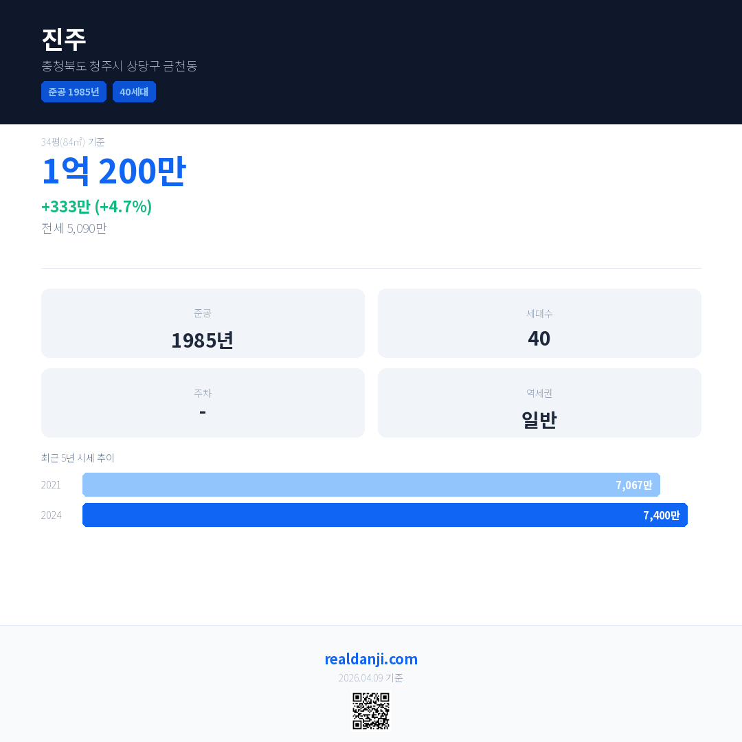 진주은(는) 1985년에 준공되었으며, 현재 41년차입니다. 총 40세대 규모입니다.