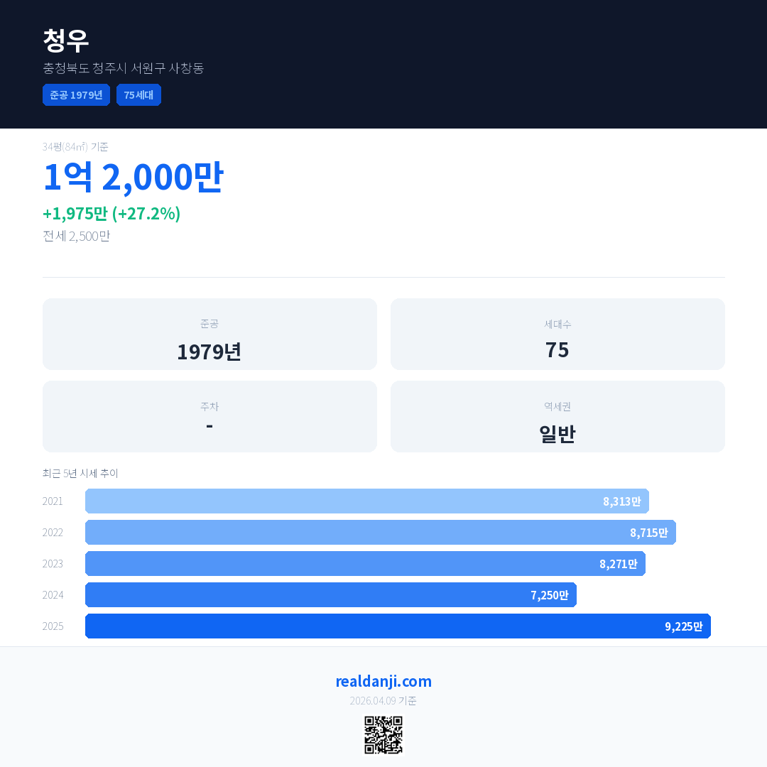 청우 국민평형 기준 2025년 평균 거래가는 9,225만으로, 전년 대비 27.2% 상승 했습니다.