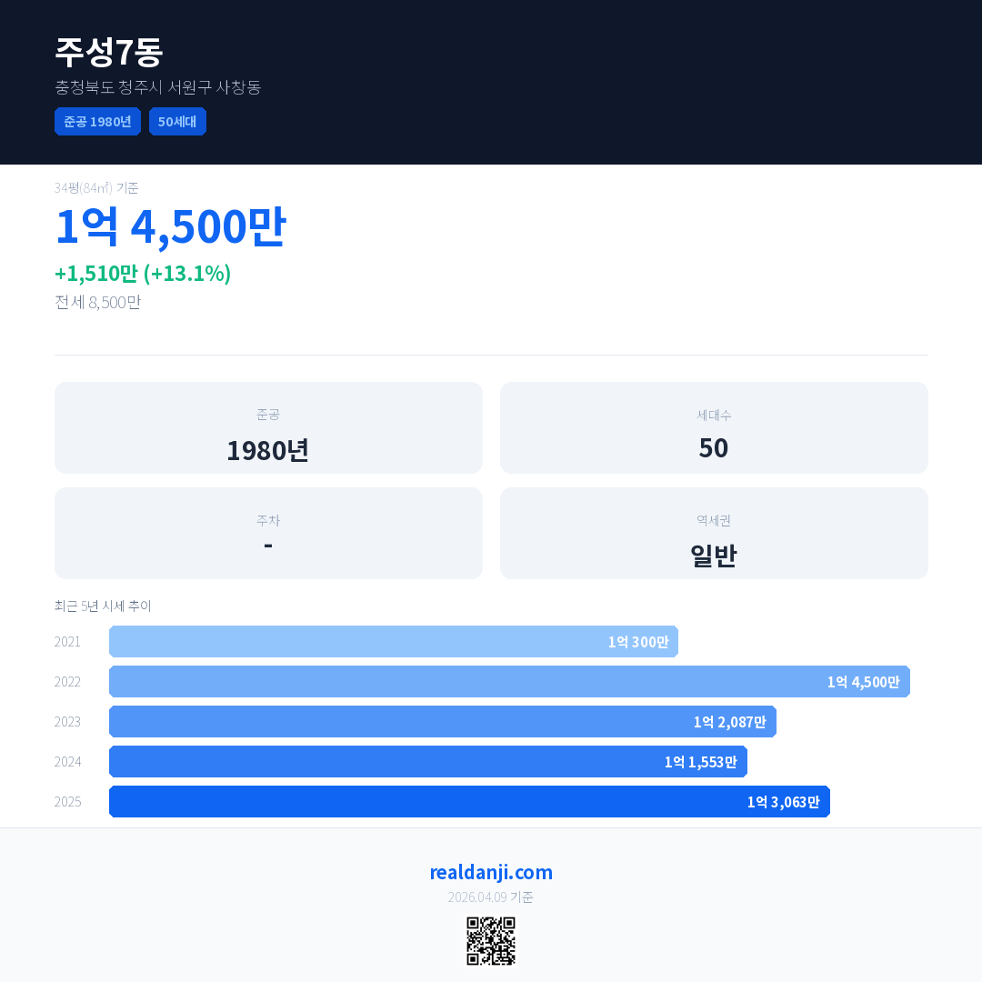 주성7동 국민평형 기준 2025년 평균 거래가는 1억 3,063만으로, 전년 대비 13.1% 상승 했습니다.