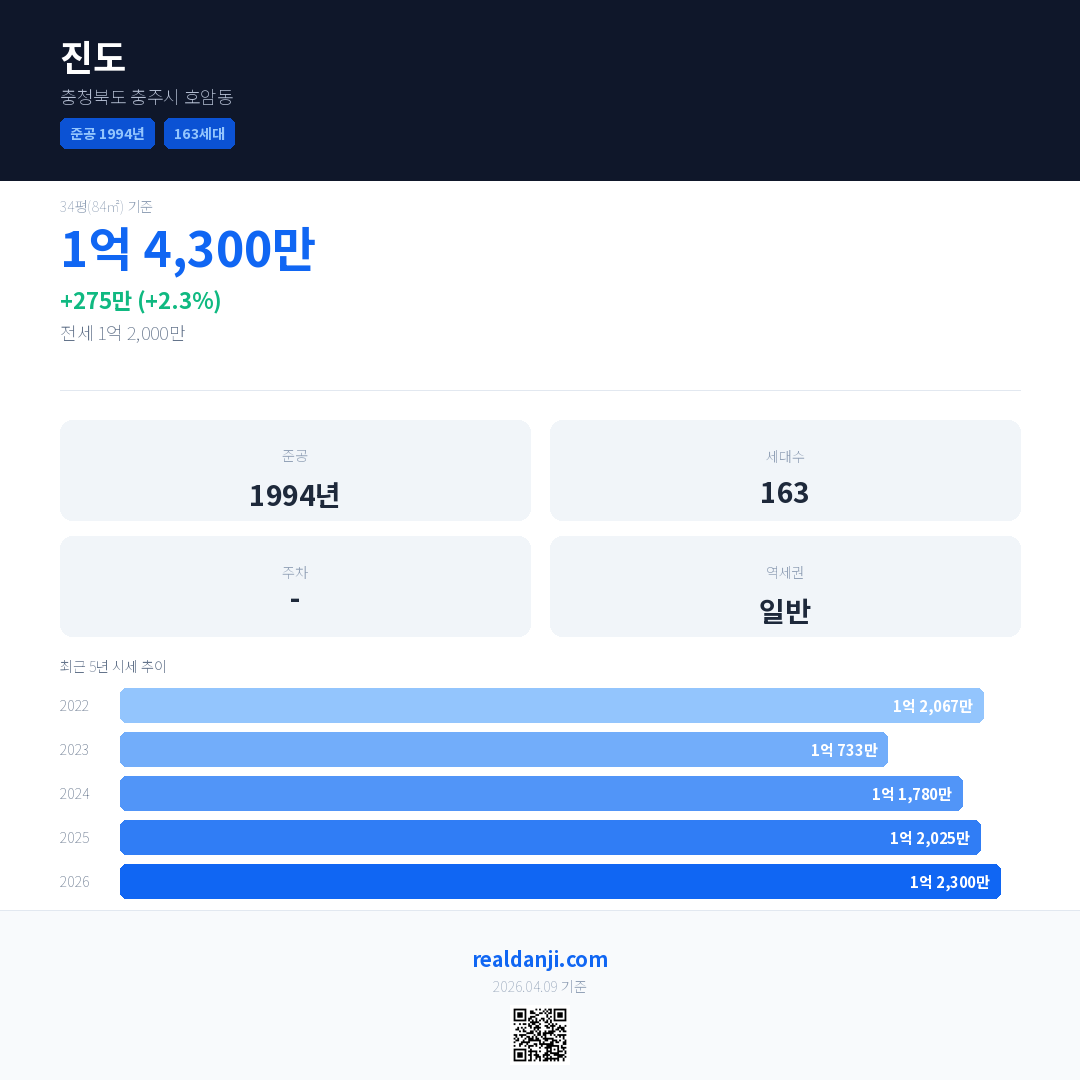 진도 국민평형 기준 2026년 평균 거래가는 1억 2,300만으로, 전년 대비 2.3% 상승 했습니다.