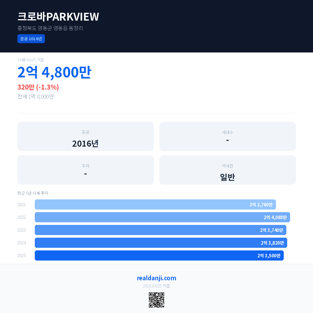 크로바PARKVIEW 국민평형 기준 2025년 평균 거래가는 2억 3,500만으로, 전년 대비 1.3% 하락 했습니다.