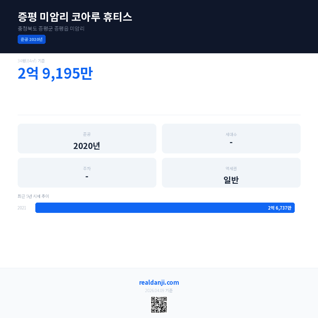 증평 미암리 코아루 휴티스 최근 거래가는 2억 1,290만입니다. (2021-11)