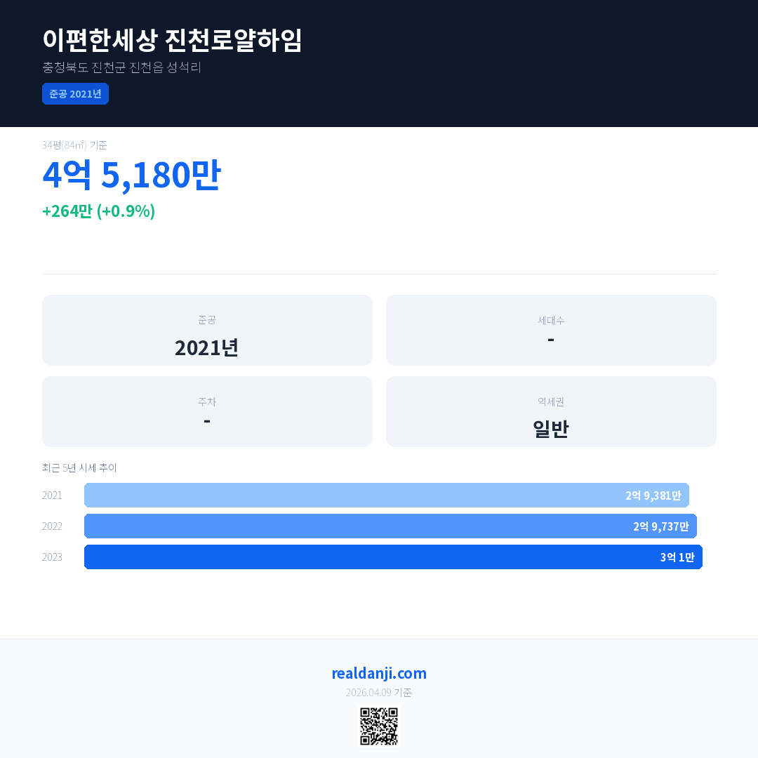 이편한세상 진천로얄하임은(는) 2021년에 준공되었으며, 현재 5년차입니다.