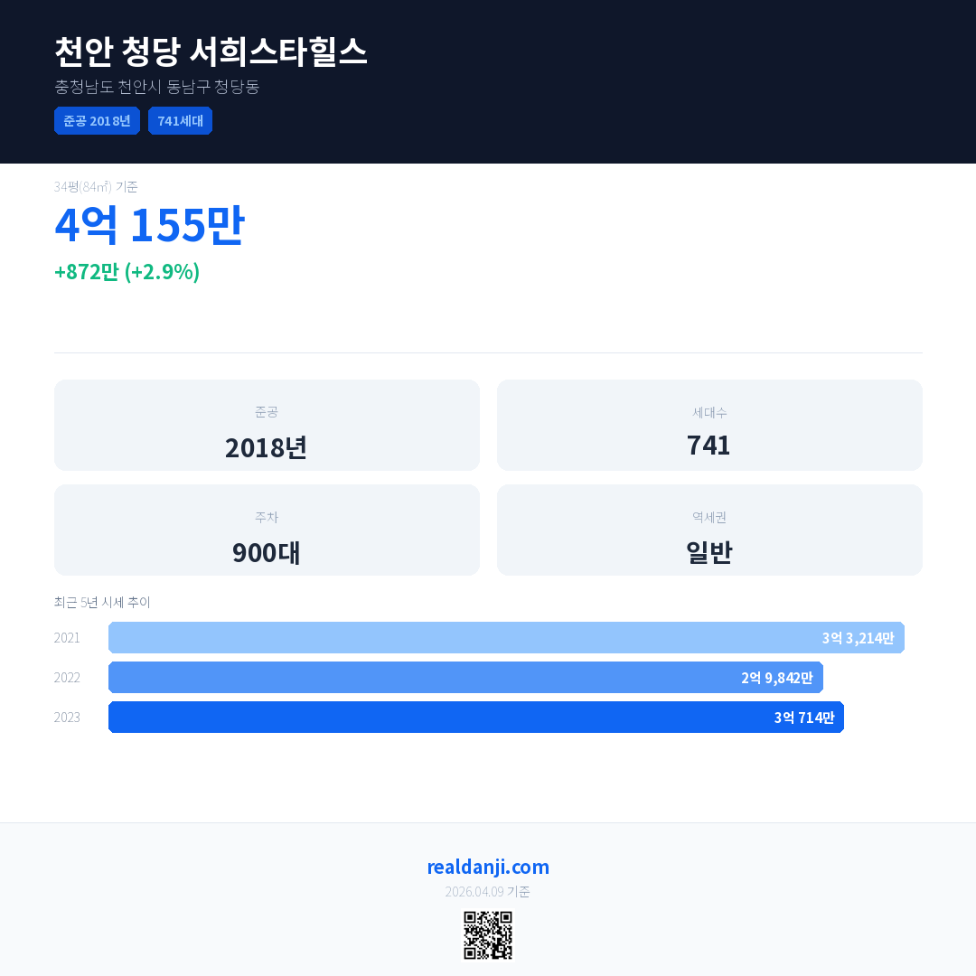 천안 청당 서희스타힐스 최근 거래가는 4억 155만입니다. (2023-02)