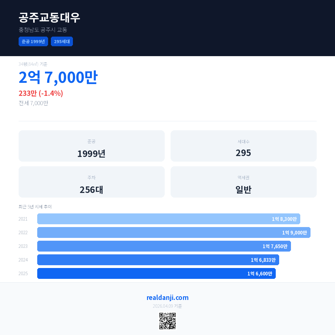 공주교동대우은(는) 1999년에 준공되었으며, 현재 27년차입니다. 총 295세대 규모입니다.