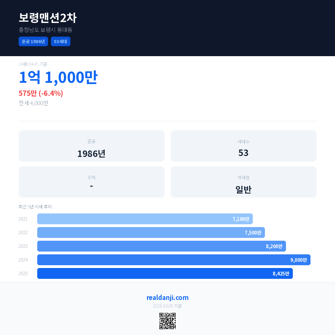 보령맨션2차 국민평형 기준 2025년 평균 거래가는 8,425만으로, 전년 대비 6.4% 하락 했습니다.