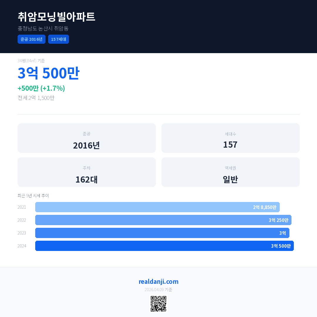 취암모닝빌아파트 국민평형 기준 2024년 평균 거래가는 3억 500만으로, 전년 대비 1.7% 상승 했습니다.